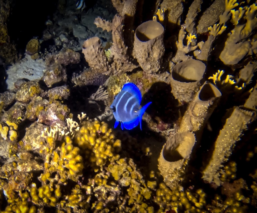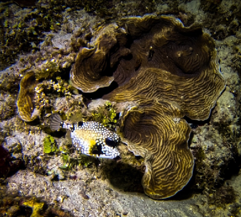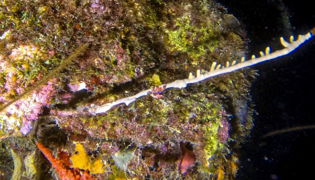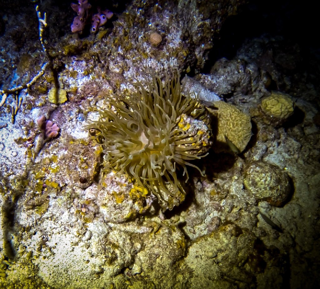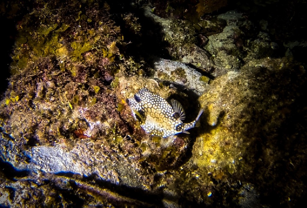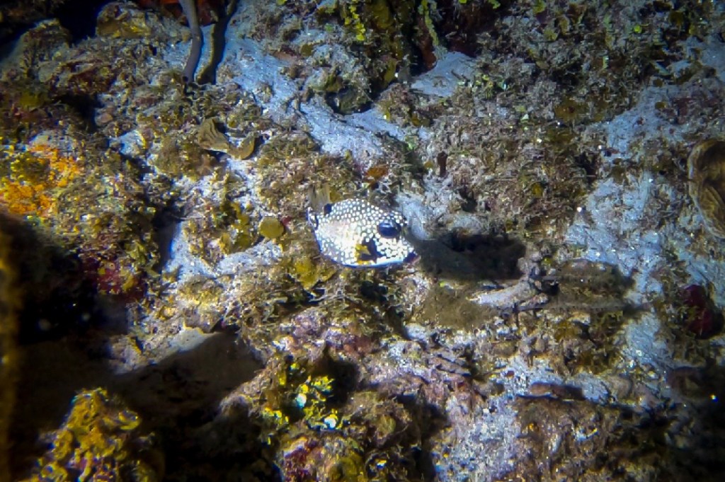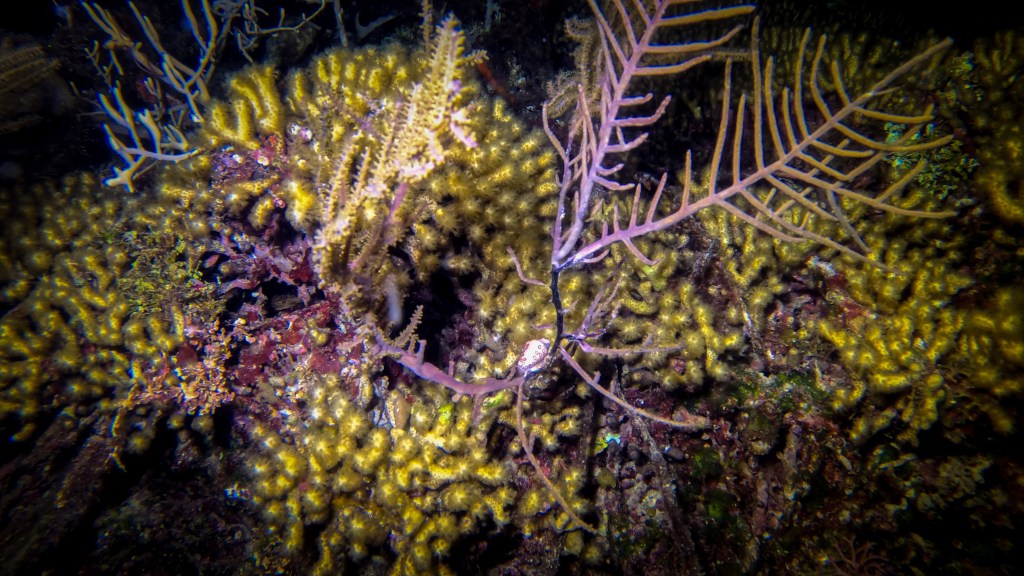 They do their night dives at a site called Tugboat, and for obvious reasons. After going out for about 25 minutes, we made the turn back and near where we started there was a….sunken tugboat.
